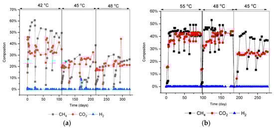 The anomalies in CH4 and CO2 production were also confirmed by the gradual changes in the biogas composition with temperature shifts. As can be seen in Figure 2a, the CH4 and CO2 contents produced at 42 °C fluctuated within the ranges 4–61% and 23–46%, respectively, and then decreased significantly along with the temperature shift to 45 °C in which the CH4 and CO2 contents varied within the ranges 0–30% and 6–24%, respectively. Interestingly, at 45 °C, there is a modest spike in H2 composition to 8–9%, followed by increasing H2 production (Figure 1a), signifying the potential absence of hydrogenotrophic methanogen activity, which consumed CO2 and H2 to produce CH4. High CO2 and H2 in the AD process indicate that the CH4 was primarily produced from acetate via acetoclastic pathways. After the temperature was further shifted to 48 °C, other than a sharp decline in H2 production, there was no noticeable difference in biogas composition.
