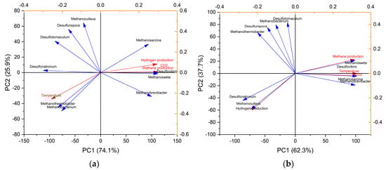 PCA of methanogens, SRB, and biogas production for (a) an upshifted temperatures scenario and (b) a downshifted temperatures scenario. Microorganisms were selected at the genus level of each group. The blue lines and red lines represent bacteria and biogas production factors, respectively.