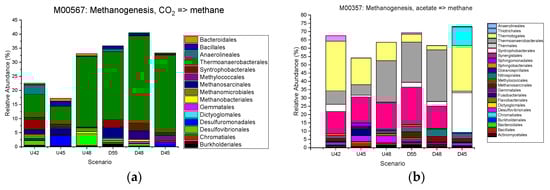In the acetoclastic methanogenesis pathway (M00357), two enzymes play an essential role in methane metabolism: acetate phosphotransferase (EC: 2.7.2.1) and acetyl-CoA synthetase (EC:6.2.1.1). Acetate phosphotransferase/acetate kinase (Ack) is responsible for switching and catalyzing acetate to acetyl phosphate and adenosine diphosphate (ADP) []. At the same time, acetyl-CoA synthetase is also a crucial component of the large multienzyme complex known as acetyl-CoA decarbonize/synthase (ACDS) and is responsible for breaking down acetate and producing methyl and reducing equivalents [,]. Both upshifted and downshifted temperature scenarios demonstrated a relatively high abundance of Ack genes. However, the downshifted temperatures scenario had a higher and less oscillating abundance of ACS genes than the upshifted temperature scenario, contributing to a more stable biogas production. The resiliency of the downshift temperature scenario was also exhibited by the high abundance of genes involved in CH4 production through methylamine, dimethylamine, trimethylamine (M00563), and methanol (M00356) pathways. Methanosaeta and Methanosarcina were the only methanogens known to produce CH4 via coenzyme-M methyltransferase for M00563 and M00356 synthesis, and they dominated the methanogen community in downshifted temperature scenario.