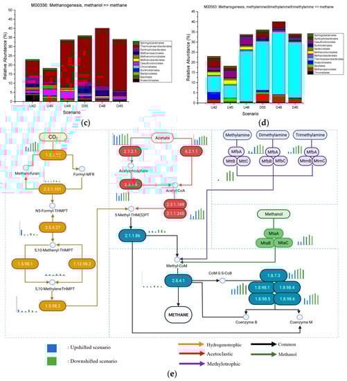 The relative abundance of genes associated with methanogenesis in U42, U45, U48, D55, D48, and D45 in four methanogenesis pathway modules: (a) M00567, (b) M00357, (c) M00356, and (d) M00563. (e) The relative abundance of genes in each enzyme involved in four KEGG methanogenesis modules.