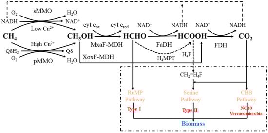 The oxidation process of methane driven by aerobic methanotrophs is shown in Figure 1. Firstly, methane is oxidized to methanol by MMO, which is unique to aerobic methanotrophs and divided into two categories. The soluble MMO (sMMO) has broad substrate specificity, which is particularly effective in co-metabolizing halogenated aliphatic compounds; however, it is produced by only a few methanotrophs (mainly type II methanotrophs) [], whose expression is inhibited in high copper environments (>2.5 μmol·g−1) []. Thus, it is more meaningful to study the application of particulate MMO (pMMO) in methane oxidation []. The pMMO consists of α, β, and γ subunits, in which the pmoA gene encoding α subunit can be used as a functional biomarker of proteobacteria in aerobic methanotrophs []; this is except for Verrucomicrobia and Crenotrichaceae, because of the phylogenetic differences in pMMO [,]. Methanol is then calcined to formaldehyde by the pyrroloquinolinequinone (PQQ)-dependent methanol dehydrogenase (MDH), which is also classified into two types. The MxaF-MDH contains the cofactors PQQ and calcium requiring cytochrome c as an electron acceptor []; the other is the Xoxf-type MDH, found in the phylum Verrucomicrobia [] and in the NC10 bacteria [], which requires lanthanum to maintain activity; notably, it can directly oxidize methanol to formate via a four-electron transport pathway []. Subsequently, a part of formaldehyde was assimilated via the Rump or SC pathway, releasing organic intermediates such as acetate and citrate. The other portion is dissimilated and continues to be oxidized to produce CO2, which is released to the outside of the cell, and the other part is fixed by the CBB cycle to provide the necessary carbon via formaldehyde dehydrogenase and formate dehydrogenase. Importantly, the process in turn provides a reduction equivalent (NAD(P)H) for the initial oxidation step of methane oxidation []. In terms of electron transfer, MMO utilizes electrons to convert methane into methanol. Among the electron donors of particulate pMMO, three possibilities exist: (1) Ubiquinol (Q8H2) serves as the electron donor for methane oxidation while MDH directly supplies electrons to complex IV via cytochrome c; (2) the composite structure of pMMO and MDH directly facilitates electron transfer from MDH to pMMO, in which MDH acts as the electron donor for methane oxidation; (3) reverse electron flow occurs from cytochrome c to ubiquinone via the ubiquinol–cytochrome c reductase [,,]. The produced methanol is subsequently oxidized to formaldehyde, formate, and CO2, with electron transfer coupled to cyt cox/cyt cred or NAD/NADH, respectively. This enables the completion of the electron transfer process. The NADH generated during this process can return to the initial step, acting as an electron donor for sMMO []. Additionally, the small organic molecules produced during this process and the carbon assimilation pathway can serve as electron donors for the denitrifiers involved in nitrogen removal. Furthermore, when microorganisms exhibit a high energy demand or when the nitrate concentration in the environment is relatively high, direct electron transfer via methane–nitrate/nitrite coupling is often employed [].