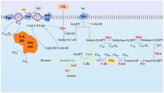 As shown in Figure 2, the CH4 is first converted to Methyl coenzyme M (methyl-S-COM) by the action of Mcr during AOM, which is the rate-limiting step of the reverse methanogenesis pathway [], so that the rate of AOM can be enhanced by elevating the partial pressure of methane [] and the concentration of Mcr []; thereafter, the methyl of Methyl-S-CoM is transferred to H4MPT to form Methyl-H4MPT under the function of Mtr []; subsequently, Methyl-H4MPT is converted to CO2 via a series of enzymatic reactions. Apart from all the genes involved in the AOM process, there is also the gene narGH that encodes nitrate reductase in Ca. ‘M. nitroreducens’, which may be obtained via lateral gene transfer via Protein Proteobacteria []. Nevertheless, Ca. ‘M. nitroreducens’ can only accomplish part of the denitrification process when the genes encoding the subsequent steps of denitrification are not detected.