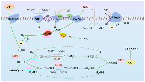 Subsequently, Wu et al. [] further refined the energy metabolic pathways and central metabolic processes of Ca. ‘M. oxyfera’ through genomics. First, NO2− is converted to NO by cd1-Nir, which is later converted to N2 and O2 by NOD, in which 25% of the O2 enters the terminal respiratory chain for productivity, and the remainder is used for aerobic methane oxidation []. Later, the part comprising formaldehyde is oxidized to CO2 via the H4MPT pathway under the action of FaDH and FDH. In terms of electron transport, NAD(P)H dehydrogenase can be coupled with the NAD(P)H oxidation process and to the quinone reduction process to achieve proton pumping. In addition, the cytochrome bc1 complex can oxidize quinone, realizing the diffusion transfer of protons. Finally, the electrons carried by cytochrome c transfer to cd1-Nir to complete the reduction of NO2− [] (Figure 3).