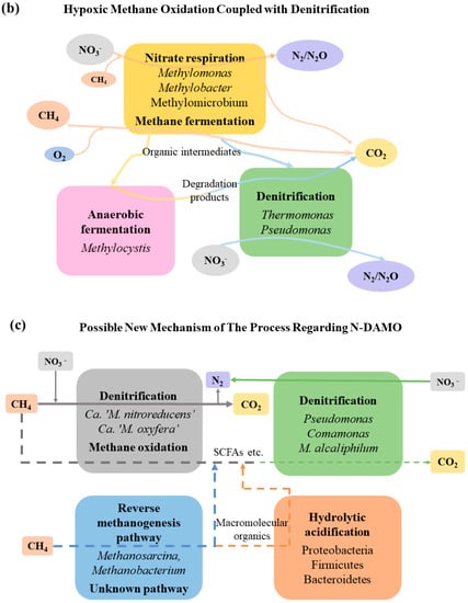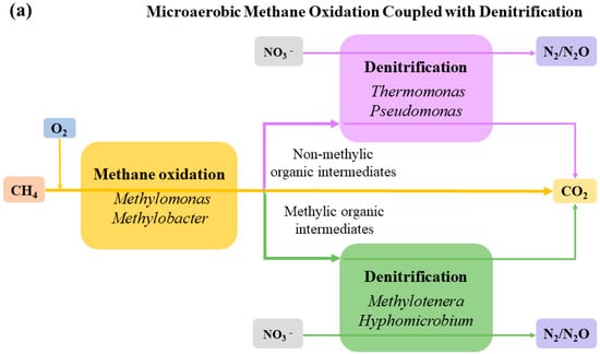 Aerobic methanotrophs and the relevant denitrifying bacteria are the main microorganisms involved in the AME-D process. The extensive and inefficient use of pesticides and fertilizers in modern agriculture has resulted in the loss of a large number of nitrogen sources to the ecological environment, such as lakes, wetlands, groundwater, etc. [], the oxic–anoxic environments that provide a livable place for methanotrophs and denitrifiers [].
