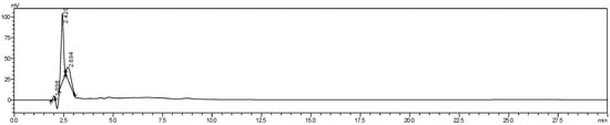 The biosurfactant produced by L. paracasei N2 with glycerol as substrate (2.77 ± 0.03 g/L) reduced the surface tension of water from 72 to 38.05 ± 0.56 mN/m with a CMC of 15 mg/mL and an emulsification index of 74.25 ± 1.64%. The chromatogram obtained from the RP-HPLC of the biosurfactant from L. paracasei N2 showed one peak at a retention time of 2.42 min corresponding to the solvent and another one at 2.69 min corresponding to the biosurfactant (Figure 2). This result indicates the purity of the biosurfactant.