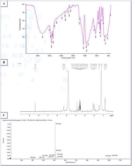 FTIR spectrum (A), 1H NRM spectrum (B) and HRMS spectrum (C) of the biosurfactant produced by L. paracasei subsp. tolerans N2 with glycerol as substrate.