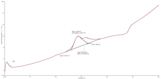 Differential scanning calorimetry was used to assess the behavior of the biosurfactant while submitted at high temperatures (30–300 °C). The thermogram obtained (Figure 4) showed the most visible transition temperature of the biosurfactant at 143.08 °C and another at approximately 250 °C. These two transitions might be attributed to the evaporation of water (143.08 °C) and the degradation of the side chains of the constituent elements of the biosurfactant which are proteins, sugars and lipids (250 °C). A similar behavior was observed for glycolipopeptide biosurfactants by Gil et al. [].