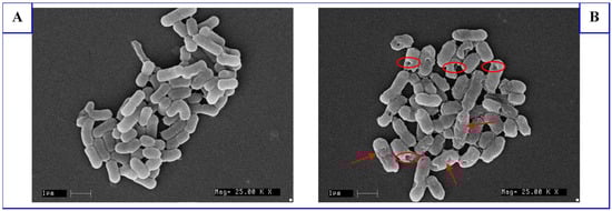 SEM images showing untreated cells of E. coli EM2 (A) and cells of E. coli EM2 treated with biosurfactant produced by L. paracasei subsp. tolerans N2 with glycerol as substrate (B). Arrows referred to the cell wall and membrane disintegrations, while circles indicated cell lysis.