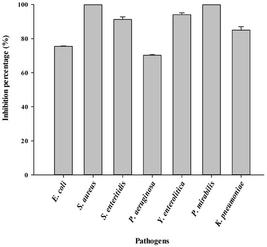 Pathogenic strains of Escherichia coli EM2, Staphylococcus aureus SA1, Salmonella enteritidis PE1, Pseudomonas aeruginosa CT3, Yersinia enterolitica MH5, Proteus mirabilis MR2, and Klebsiella pneumoniae AG5 were isolated and identified from braised fish sold in Yaoundé []. The strains were sub-cultured twice in Brain–Heart Infusion broth (BHI, LiofilChem, Roseto degli Abruzzi, Italy) before being used.