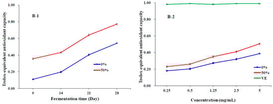 Phenolic acids are mainly present in three forms: soluble free, soluble conjugated, and insoluble-bound states. Fermentation products (10 g, 60 mesh) were extracted with 100 mL of 80% ethanol three times, the supernatants were used to extract free phenolics and free/conjugated phenolics [], and the residues were digested with 4 M NaOH and were used to extract bound phenolics as per the described method []. Samples were determined in triplicate and were expressed as milligrams of gallic acid equivalents per gram of dry weight (mg GAE/g d.w.).