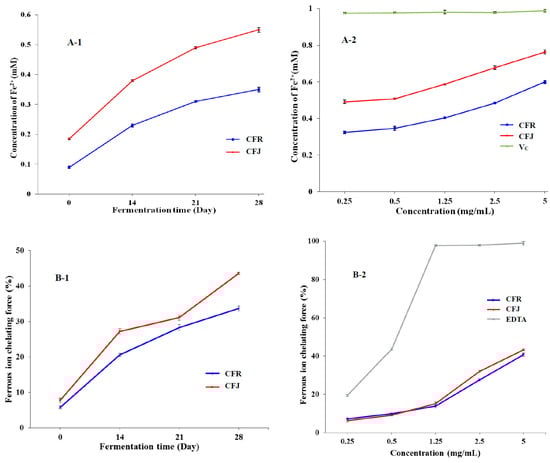 The transition metal ions of iron were considered as important catalysts for the generation of free radicals, which initiate the radical chain reaction or radical-mediated lipid peroxidation []. Ferrous ions could chelate with ferrozine and result in a red color complex formation. The chelating agents or antioxidants may disrupt the ferrozine-Fe2+ complex, thus decreasing the red color. The measurement at 562 nm of the rate of color reduction, therefore, allows for the estimation of the chelating activity. A lower absorbance indicates a higher chelating ability. The trends for the chelating ability of the SSF-jujube extracts were elevated. On the 28th day of fermentation, the ferrous ion-chelating power of CFJ and CFR was 43.63% and 33.73%, respectively (Figure 2(B-1)). Figure 2(B-2) reveals the dose–response curves for the chelating ability. It is evident that the chelating actions of SSF-jujube on the ferrous ions due to the formation of the ferrozine–Fe2+ complex with increasing concentrations, but the difference between CFJ and CFR was not found to be significant.