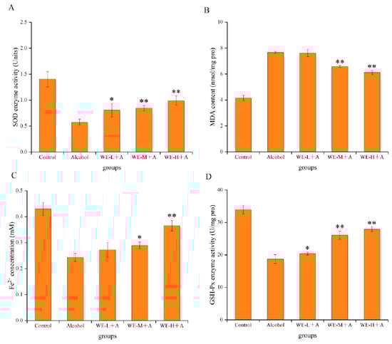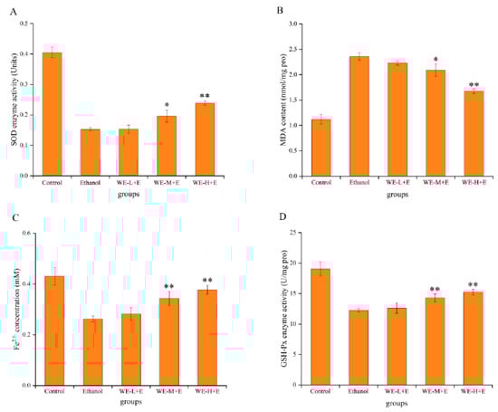 The levels of MDA and T-AOC, and the antioxidant enzyme activities of SOD and GSH-Px in the zebrafish tissue homogenate had been measured to evaluate the oxidative stress effects. As shown in Figure 3, at the end of the 28 day exposure, treatment with ethanol significantly decreased the activities of SOD, GSH-Px (Figure 3A,D), and the levels of T-AOC (Figure 3C), and significantly increased the levels of MDA (Figure 3B) compared to those in the control group. According to previous studies on oxidative stress and inflammation related to liver injury [], the above data signified that ethanol could remarkably aggravate the degree of oxidative stress in adult zebrafish, which further demonstrates that the zebrafish liver would be damaged by ethanol toxicity. Whereas, after the challenge treatment with different concentrations of the SSF-jujube extract, the antioxidant enzymes activities (SOD and GSH-Px) in adult zebrafish tissues significantly increased, while the content of MDA decreased, and the T-AOC levels increased when compared to the ethanol treatment group. The antioxidant activity of the high concentration water extract (WE-H + E group) in adult fish was the most significant in a dose-dependent manner. The results indicated that the aqueous extract of the culture obtained by adding 50% Chinese jujube in the culture medium had a certain alleviating effect on the oxidation reaction in adult zebrafish caused by ethanol and could protect the adult fish from alcoholic liver damage to some extent.