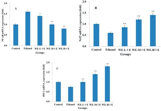 Effects of SSF-jujube with Cordyceps militaris on the relative RNA expression levels of zebrafish larvae against ethanol-induced oxidative stress. (A) NF-κB; (B) Nrf2; and (C) HO-1. Ethanol represented the 2% ethanol group; WE-L + E represented the 10 μg/mL water extracts +2% ethanol group; WE-M + E: 30 μg/mL water extracts +2% ethanol group; and WE-H + E: 50 μg/mL water extracts +2% ethanol group. Values are means ± SD (n = 3). * p < 0.05, ** p < 0.01 vs. the 2% ethanol group.