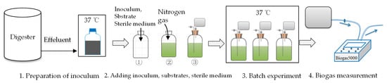 The procedure for the batch test, ① addition of substrate, inoculum, and inorganic salts, ② flush with 99.99% nitrogen gas, and ③ sealed digester.