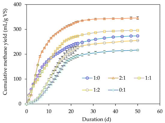 Results of the cumulative methane yield of anaerobic co-digestion of chicken manure and corn stover under different mixing ratios in the batch model.