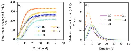 Results of (a) predicted biochemical methane potential and (b) the methane production rate of anaerobic co-digestion under different mixing ratios analyzed using the modified Gompertz model.