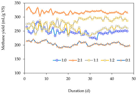 The performance of methane production in CSTRs, as illustrated in Figure 5, demonstrates successful operation for a period of 45 days or more. The variations in methane yield among the different groups of substrate ratios investigated were significant. Initially, an increasing ratio of CS to CM from 0:1 to 1:2 was observed to significantly enhance the methane yield, which was followed by a slight decline at a CS to CM ratio of 1:1. A sharp reduction was observed as the substrate composition shifted towards 100% corn stover, as shown in Table 4. A maximum methane yield of 318 mL/g VS was achieved with a mixing ratio of 2:1, representing a 28.7%, 9.2%, 22.7%, and 55.1% higher yield compared to the 1:0, 1:1, 1:2, and 0:1 ratio, respectively. Under continuous conditions, the methane yield was slightly lower than that observed in batch tests. Generally, the methane yields from mixtures of CM and CS were approximately 300 mL/g VS, which is comparable to other feedstocks with high energy density, such as food wastes, as reported by Bi et al., 2020 [37]. Table 5 highlights previous studies on the anaerobic co-digestion of chicken manure and corn stover, where the CM to CS ratio was set from 3:1 to 1:3, indicating that substrate ratios significantly enhance methane yield. It has been proven that a higher CM/CS ratio is beneficial to methane production and that increasing digestion time may result in more methane production in batch conditions [24,38,39]. Our analysis indicates that the optimal mixing ratio for the co-digestion of chicken manure and corn stover is 2:1 in the current experimental, which maximizes methane production.