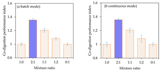 In this study, the CPI values were utilized as a metric to evaluate the antagonistic (CPI < 1), additive (CPI = 1), and synergistic (CPI > 1) interactions during the co-digestion of chicken manure and corn stover. Results derived from batch and continuous tests demonstrated that all co-digestion processes exhibited a CPI value greater than 1, ranging from 1.08 to 1.39 (Figure 6). The synergistic effect was observed to initially increase and then decrease with an increase in the corn stover proportion. The highest CPI values of 1.36 and 1.39 were obtained with a mixing ratio of 2:1 in batch and continuous models, respectively, indicating that the co-digestion of the mixture demonstrated a superior promoting effect in the continuous experiments. In prior batch experiments, CPI ranged from 1.01 to 1.42 for chicken manure [11] and 1.44 to 1.87 for piggy manure co-digestion with corn stover [40]. Karki et al., 2021 reported that co-digestion could aid in achieving a better carbon–to–nitrogen balance, whereby a higher proportion of manure in the mixture could offset the accumulation of VFAs, leading to an improvement in methane production [15]. These findings suggest that co-anaerobic digestion is not merely the addition of substrates and that an appropriate ratio can significantly enhance the synergistic effect. Furthermore, our results indicate that co-digestion of chicken manure and corn stover improved anaerobic digestion performance, with a 2:1 ratio resulting in a substantial enhancement of the synergistic effect under experimental conditions.