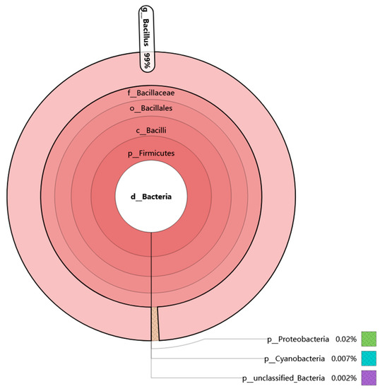 Douchi is one of the traditional natural fermented soybean-based foods in China, whose production process is similar to that of natto. In order to screen FE-producing bacteria more efficiently, the Illumina MiSeq method was used to analyze the bacterial diversity of mixed Douchi samples. According to our statistical analysis, it was found that there were about four phyla, six classes, seven orders, seven families and eight genera. Based on the data, Korna software was used to analyze the species composition of bacteria in the douchi samples. As is shown in Figure 1, about 99% of the bacteria in Douchi belonged to the genus Bacillus. This result is similar to previous reports that most fibrinolytic enzyme-producing strains found in douchi belonged to Bacillus [22,23,24]. However, the species composition was different from the reports about Aspergillus type douchi [28], the main genus of which was Staphylococcus and Corynebacterium. The differences may be because of the different natural production process and the differences of the main microorganisms that took part in the process.
