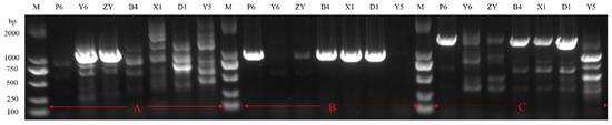 Through primary and secondary screening, seven strains were found to form large transparent zones (diameter > 12.0 mm) in fibrin plates, which indicated high fibrinolytic enzyme activity (Table 2). Among the strains, P6, ZY and Y6 were identified as Bacillus subtilis; B4, D1 and X1 were identified as Bacillus velezensis; and Y5 was identified as Bacillus licheniformis by 16S rDNA sequencing. There have been reports that all three kinds of strains could produce fibrinolytic enzymes. In order to investigate whether the strains have the ability to produce a new kind of fibrinolytic enzyme, PCR was carried out with the reported fibrinolytic enzyme gene as primers and the genome of seven strains as templates [22,23,24]. As can be seen in Figure 2, the fibrinolytic enzyme of Y5 is different from the previous fibrinolytic enzymes of Bacillus velezensis, Bacillus subtilis and Bacillus licheniformis, which indicates a new fibrinolytic enzyme. Therefore, Y5 was chosen for the further identification and further study.