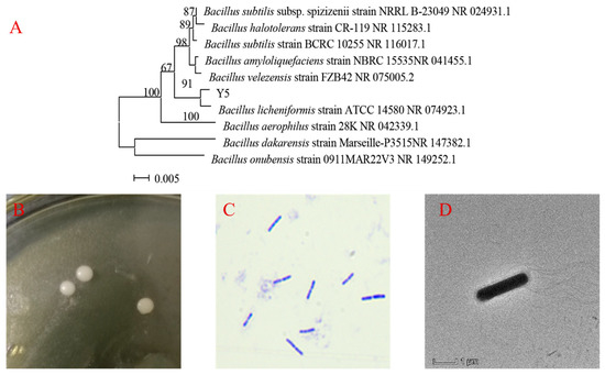 After being cultured on LB medium for 18 h at 37 °C, the colonies of Y5 were round, milky white, opaque and with a smooth surface on the edge (Figure 3B). Based on simple Gram staining and electron micrograph, the Y5 cell was rod-shaped, G+, peritrichate, with a length of 1.5–3.0 μm and a width of 0.4–0.8 μm, which is consistent with the previous reports about the morphology of Bacillus licheniformis. Moreover, the 16S rDNA sequence of Y5 was compared to all sequences in the GenBank for species identification. It was found that the best match (91% homology) was to that of Bacillus licheniformis strain ATCC 14,580 (NR 074923.1). A phylogenetic tree was constructed using the neighbor-joining method (Figure 3A), and Y5 was identified as Bacillus licheniformis using phylogenetic analysis. However, sometimes Bacillus licheniformis, Bacillus subtilis, Bacillus velezensis and Bacillus amyloliquefaciens are easily confused when tested only by 16S rDNA analysis. Two kits, HBI G14 and API 50 CHB, were used to carry out physiological and biochemical identification of Y5. The results of Table 3 show that Y5 is a typical Bacillus licheniformis, which is also consistent with the previous reports about Bacillus licheniformis. Bacillus licheniformis Y5 was deposited in the China Center for Type Culture Collection (CCTCC No:M2020796).
