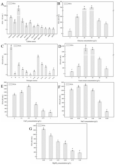 The effects of fermentation medium components, including carbon sources, nitrogen sources and metal ions, on Y5 FE production were determined. Carbon sources can provide energy as well as the carbon skeleton of microbial cell and microbial metabolites [5]. Nitrogen sources can provide nitrogen for bacterial proteins, enzymes, nucleic acids and other biological macromolecules that the microorganism need [29]. Metal ions also play an important role in the growth and reproduction of microorganisms and the activity and yield of enzymes, such as calcium, chlorine, sodium and zinc. The metal ions can help to ensure the microorganism is in a normal osmotic pressure and redox potential environment. Moreover, some metal ions are also important components of enzymes and participate in enzymatic reactions as activators, while some metal ions may inactivate the enzyme molecule by binding to the thiol group of the enzyme, destroying its disulfide bond, or replace the native metal ions [30,31]. Therefore, it is important to select the appropriate carbon source, nitrogen source and metal ions.