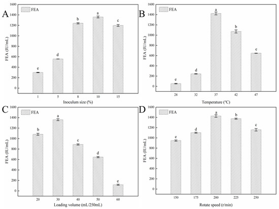 Effects of fermentation conditions on Y5 FE production: (A) inoculum size, (B) temperature, (C) loading volume, and (D) rotate speed. Different lowercase letters indicate significant (p < 0.05) differences in means according to Tukey’s HSD test. All assays in the figure were carried out in triplicate (n = 3).