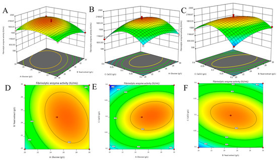 Three-dimensional (3D) surface graph and contour plot of fibrinolytic enzyme production for every two factors. (A,D): for glucose concentration and yeast extract concentration; (B,E): for glucose concentration and CaCl2 concentration; (C,F): yeast extract concentration and CaCl2 concentration.