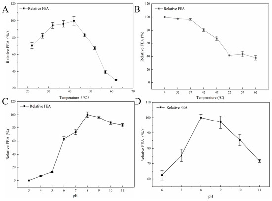 The optimal temperature, pH and stability of Y5 FE: (A) optimal temperature, (B) thermal stability, (C) optimal pH, (D) stability of Y5 FE under different pH. All assays in the figure were carried out in triplicate (n = 3).