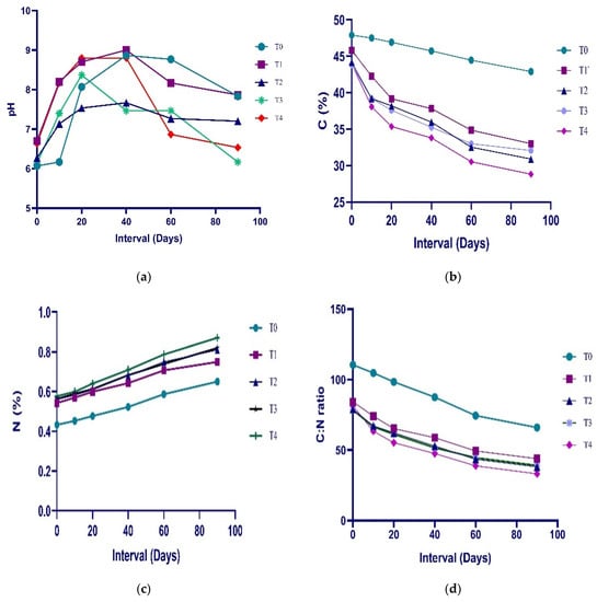 The pH values of the five treatments were in the ranges of 6.06 (T0)–9.0 (T1) during composting (Figure 1a). A trend of initial increase was followed by a gradual decrease in all the treatments. The treatment T3 (6.16) and T4 (6.5) were slightly acidic till the end of composting (Table 1). The change in pH could be due to the production of organic acids and other intermediate compounds (e.g., CO2, NH3, NO3−) by the action of microorganisms and earthworms []. The high pH values in the initial period (up to 40 days) may be due to the mineralization of organic nitrogen into ammonia. The decrease in pH conserves the nitrogen in the final compost as nitrogen is lost as volatile ammonia. The compost’s pH determines the efficiency of composting by affecting the nutrient’s availability. Microbial activity is also affected by the pH of composting as they grow well in neutral pH []. Thus, the rate of production of organic acids and other intermediate compounds is affected by pH changes which consequently affects the degree of mineralization and microbial population in the composting material []. The results were comparable to the findings of other studies [,,,,].