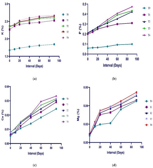 In the present study, Mg content in all treatments at the final stage was 0.045%, 0.046%, 0.051%, 0.053 and 0.054% in T0, T1, T2, T3 andT4, respectively, showing a significant difference between all the treatments (p < 0.05), (Figure 2d). The increasing trend of Mg was T0 (257%), followed by T1 (411%), T2 (537%), T3 (562%) and T4 (600%) (Table 2). The activities of earthworms support the colonization of fungi, which increases the availability of Mg in organic matter []. Vermicomposting of rice straw, when mixed with cattle dung, increases Mg content (17–40.8%) significantly []. Arora and Kaur [] observed a similar trend of increased Mg in rice straw vermicompost. The enhanced contents of Mg in the mature compost indicated its enhanced nutritive value.