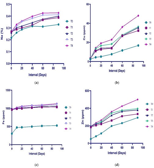Sodium is an important plant nutrient, as it prevents soil acidification by increasing other nutrients in the form of oxides, hydroxides and carbonates [,]. In the present study, Na content increased in all the treatments compared to the initial values, as illustrated in Figure 3a. The Na content in prepared compost was in the range of 0.32 ± 0.003 to 0.42 ± 0.003%, which was 1.52–1.61 fold higher than the initial Na content (Table 2). There was a significant difference between all the treatments (p < 0.05). Several studies also reported an increase in the Na content of vermicompost made from various wastes [,,,].