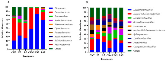 The relative abundance of bacteria at the phylum (A) and genus (B) levels in perennial ryegrass silage treated with different additives. CK, without additives; F, formic acid; L, Lactiplantibacillus plantarum combined with Lactiplantibacillus buchneri; 7, 7 days of ensiling; 45, 45 days of ensiling.
