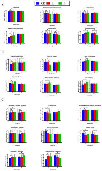 Figure 2A depicts the metabolic route at the first pathway level. At seven days of silage, the L and F treatments had significantly higher gene abundances than the CK treatment for “organism system”, “genetic information processing” and “metabolism” (p < 0.05). In comparison to the CK treatment, genes involved in “environmental information processing”, “cellular processes,” and “human diseases” were significantly less common (p < 0.05). A stabilized inner environment might have developed at a later stage of fermentation because there was no discernible difference in “metabolism” between the treatments at 45 days of silage (p > 0.05). The aforementioned findings demonstrated that whereas L might improve the fermentation quality of LP mostly by boosting the population of advantageous bacteria such as LAB, F might do so by limiting the “membrane transport” and “signal transduction” of unwanted bacteria.