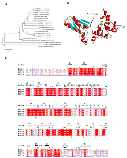 Phylogenetic tree (A), homology model (B), and multialignment analysis (C) of LeFae. (A) The phylogenetic tree for LeFae was analyzed using the neighbor-joining (NJ) method. Putative catalytic residues (pentacle).