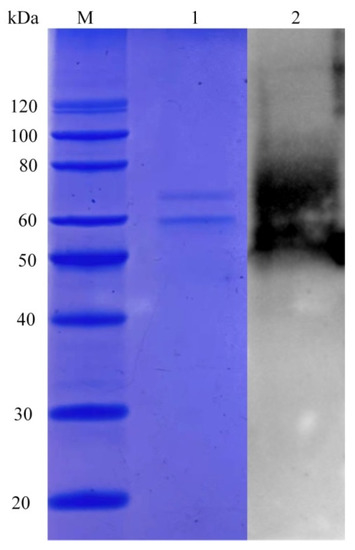 Analysis of recombinant LeFae using SDS-PAGE and Western blot. M, protein marker; 1, purified LeFae; 2, Western blot analysis of LeFae.