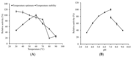The temperature dependency of LeFae was analyzed using 0.1 M sodium citrate buffer (pH 5.0) and 1% starch-free wheat bran at 20–90 °C for 1 h, and the LeFae activity was assessed based on the preceding delineation. Similarly, the effect of pH on LeFae activity was determined using 0.1 M sodium citrate buffer (pH 3.0–7.0) or 0.1 M sodium phosphate buffer (pH 7.0–9.0) at 60 °C. The activity obtained was expressed as relative activity, with the maximum activity set at 100%. Thermal stability was determined after pretreating LeFae at 30–90 °C for 1 h, respectively, and then residual activity was analyzed under optimal conditions.