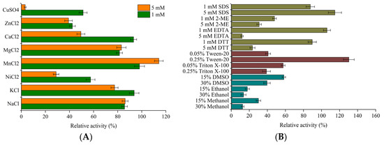 Except for Mn2+, other metal ions more or less inhibited the activity of LeFae (Figure 4A). The inhibitory effect of Zn2+, Cu2+, and Ni2+ on the activity of LeFae was observed to be substantial. The three ions inhibited LeFae activity by 43–48% at the concentration of 1 mM, but as the added concentration increased to 5 mM, more than 60% of the activity of LeFae was inhibited, and especially, Cu2+ almost completely inactivated the enzyme. The influence of metal ions on FAEs is related to the source of FAEs. In a study by Kanauchi et al. [25], the presence of 1 mM of Zn2+, Cu2+, and Ni2+ had a minimal inhibitory impact on the activity of FAE from A. awamori, as evidenced by maintaining 100%, 80%, and 95% of the original activity, respectively. However, the activity of FEA from A. aculeatus was reduced by about 40% and 60% with 5 mM of Zn2+ and Cu2+, respectively [24]. Donaghy and McKay [26] observed that 5 mM of Cu2+ repressed 95% of the initial activity of FAE from Penicillium expansum. The current results were partially consistent with the preceding research. Metal ions may inhibit enzyme reactions by combining with the active group of the enzymes, causing oxidative stress and damage to proteins, or by reacting with the enzyme–substrate complex [27].