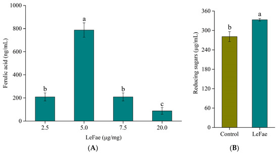 Previous studies have shown that the complexes formed by ferulic acid and other hemicellulose components through ester bonds block the accessibility of fibrolytic enzymes to fiber [4,6]. Therefore, the current study investigated the effect of removing ferulic acid using LeFae on the cellulase hydrolysis of wheat straw. Compared with the control, LeFae pretreatment significantly improved the following hydrolysis of wheat straw by cellulase, resulting in an increase in reducing sugars by 18.5% (p < 0.05, Figure 5B). This suggested that there was a synergistic effect between LeFae and cellulase on the hydrolysis of wheat straw.