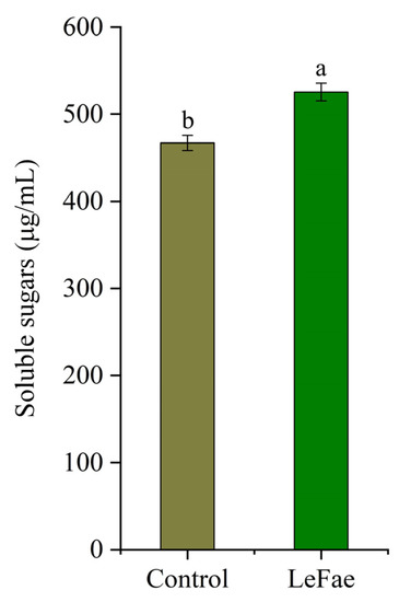 Effects of LeFae on the leached soluble sugars from wheat straw. Different lowercase letters in the figure indicate significant differences (p ≤ 0.05). Each value represents the mean ± SD.