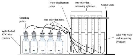 The volatile solids for water hyacinth and CM were determined based on the method in []. Using the setup shown in Figure 2, three differently formulated substrates were tested for biomethane potential (BMP) based on the volatile solids in the CM and water hyacinth. The BMP testing methods were adapted from the procedures outlined by Selvankumar et al. (2017) []. The substrates and reactors were allocated codes as follows: R1 (CM only), R2 (WH only), R3 (WH and CM in the ratio 1:1), R4 (WH and CM in the ratio 2:1), and R5 (WH and CM in the ratio 3:1). Reactors (50 mL) were used with a reaction volume of 40 mL and a headspace of 10 mL. Each reactor contained 3 g total VS for the total substrate. In each reactor, 6 g VS of CM was added as inoculum with any excess above the 6 g in the codigestion reactors being considered as a cosubstrate. As a result, an I/S ratio of 2 was maintained across all reactors. Experiments were performed in triplicate. The gas produced was collected and measured in inverted measuring cylinders (Figure 2). Before recording, the collected volumes were corrected to normal volumes (NmL) at standard temperature and pressure (STP) conditions. In addition, the endogenous gas production from the inoculum was also subtracted from the final reported values.