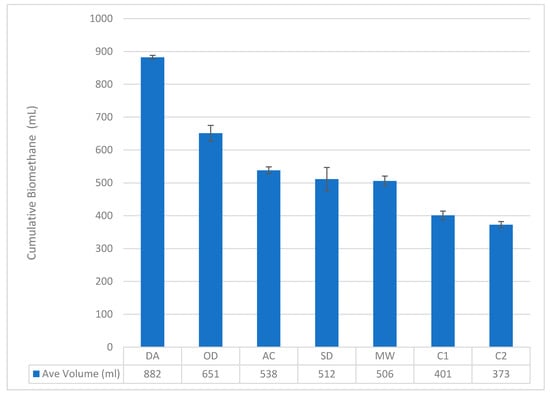 Cumulative biomethane production from the BMP tests of pretreated WH:CM mixtures at a 3:1 ratio. Pretreatments were as follows: C1 and C2 are controls with untreated substrates; aerobic decomposition (DA); oven drying (OD); autoclave (AC); sun drying (SD); microwave (MW). Gas volumes were normalized to STP conditions.