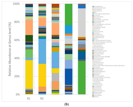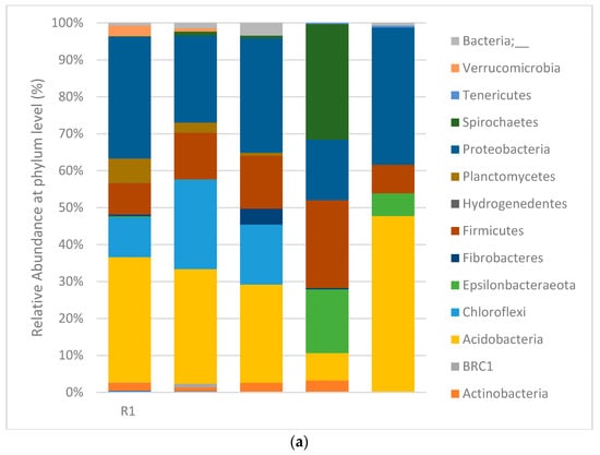 Microbial profiles in reactors at the end of the substrate incubation period. (a) Phylum level. (b) Genus level.