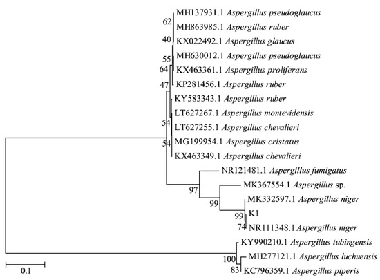 Aspergillus niger K1 was isolated and purified from the fermentation process of Tibetan tea, and it was identified by phylogenetic analysis of fungal internally-transcribed spacer sequencing (ITS). Aspergillus niger K1 was grown on potato dextrose agar (PDA) at 25 °C for 7 d, and its DNA was extracted using the Rapid Fungal Genomic DNA Isolation Kit (Omega Biotech, Norcross, GA, USA) according to the manufacturer’s instructions. The ITS of Aspergillus niger K1 was sequenced by Meiji Biomedical Technology Co., Ltd. (Shanghai, China). The genes were annotated by aligning them with those deposited in the National Center for Biotechnology Information (NCBI) ITS database. Furthermore, barcodes of 18 species within Aspergillus were downloaded from the GenBank of NCBI, and were used for phylogenetic analysis [28]. All sequences were aligned using the MUSCLE algorithm with Molecular Evolutionary Genetics Analysis (MEGA) software ver. 7.0.26, and the evolutionary history was inferred by using the Maximum Likelihood method based on the General Time Reversible model in MEGA software [29]. To evaluate the support for inferred topologies, the percentage of branches in which the associated taxa clustered together was calculated by bootstrapping with 1000 replicates. The bootstrap percentages of the maximum likelihood (ML) analysis were presented at the nodes.
