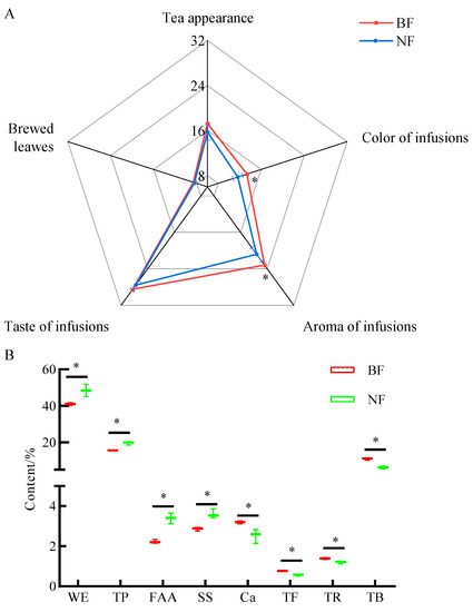 Sensory score (A) and the contents of characteristic compounds (B) of Tibetan tea in BF and NF. * Indicates significant difference at p < 0.05, WE: water extracts, TP: tea polyphenols, FAA: free amino acids, SS: soluble sugars, Ca: caffeine, TF: theaflavins, TR: thearubigins, TB: theabrownins.