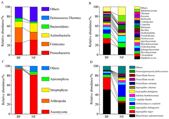High-throughput sequencing analysis of BF and NF were carried out and analyzed after DNA extraction, and PCR amplification by Meiji Biomedical Technology Co., Ltd. (Shanghai, China). The hypervariable regions V3–V4 of the bacterial 16S rRNA gene were amplified with primer pairs 799F (5′-AACMGGATTAAGATACCCKG) and 1193R (5′-ACGTCATCCCCACCTTCC) by T100 Thermal Cycler PCR thermocycler (BIO-RAD, Hercules, CA, USA), while the fungal ITS1 gene were amplified with primer pairs ITS1F (5′-CTTGGTCATTTAGAGGAAGTAA-3′) and TIS2R (5′-GCTGCGTTCTTCATCGATGC-3′). Chimeric sequences were excluded with default parameters and sequences with similarities > 97% and were clustered into one operational taxonomic unit (OTU) using QIIME (Quantitative Insights Into microbiota, V1.8.0), as described previously [18,34].