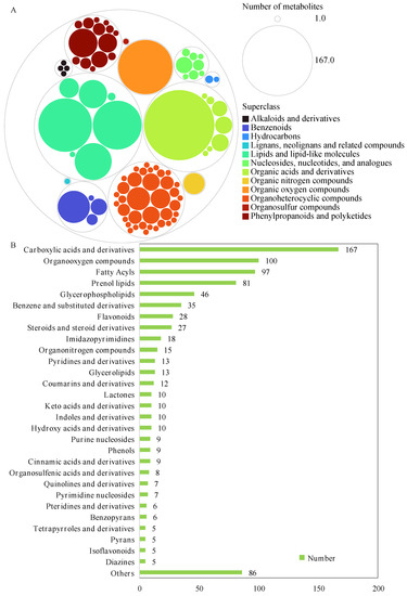 These metabolites were further grouped into 88 classes (Figure 5B), including carboxylic acids and derivatives (167 metabolites), organooxygen compounds (100 metabolites), fatty acyls (97 metabolites), prenol lipids (81 metabolite), glycerophospholipids (46 metabolites), benzene and substituted derivatives (35 metabolites), flavonoids (28 metabolites), steroids and steroid derivatives (27 metabolites), imidazopyrimidines (18 metabolites), organonitrogen compounds (15 metabolites), glycerolipids (13 metabolites), pyridines and derivatives (13 metabolites), coumarins and derivatives (12 metabolites), hydroxy acids and derivatives (10 metabolites), indoles and derivatives (10 metabolites), keto acids and derivatives (10 metabolites), lactones (10 metabolites), etc.