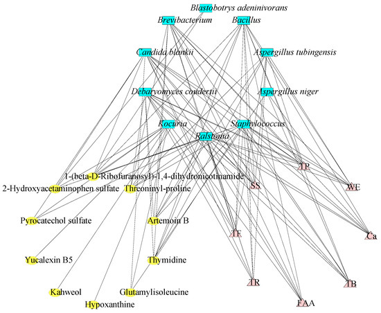 Meanwhile, Aspergillus niger showed itself to be significantly positively correlated with DCMs, such as glutamylisoleucine (p < 0.05, |r| > 0.8), and Aspergillus tubingensis was significantly positively correlated with the metabolites of thymidine, artemoin B, and threoninyl-proline (p < 0.05, |r| > 0.8). Furthermore, Kocuria koreensis showed itself to be significantly positively correlated with the metabolites of yucalexin B5, kahweol, and glutamylisoleucine, while it had a significant negative correlation with hypoxanthine, pyrocatechol sulfate, and 2-hydroxyacetaminophen sulfate (p < 0.05, |r| > 0.8). Interestingly, 1-(beta-D-ribofuranosyl)-1,4-dihydronicotinamide showed a negative correlation with the microorganisms of Bacillus rigiliprofundi, Blastobotrys adeninivorans, Candida blankii, Kocuria koreensis, Ralstonia insidiosa, and Staphylococcus kloosii (p < 0.05, |r| > 0.8). Previously, there were similar reports of the correlation between microorganisms and metabolites during the fermentation process of tea [45,46,47]. Put simply, most dominant microorganisms had a significant impact on the characteristic components, and different microorganisms had different positive and negative effects on the metabolites.