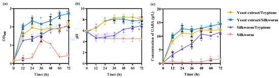 The effects of using silkworm pupae to replace the nitrogen source on (a) cell growth, (b) pH, and (c) GABA production. The strain was grown in GYP complex medium containing 50 g/L monosodium glutamate at 37 °C and 200 rpm. The GYP complex medium contained 10 g/L yeast extract and 5 g/L tryptone as a nitrogen source. The silkworm pupae meal replaced the corresponding nitrogen source. Each experiment was biologically repeated three times. The final results are expressed as the mean and standard deviation of three repetitions. Error bars represent the standard deviation of the mean. Values followed by different small letters at the same time indicate significant differences at p < 0.05.