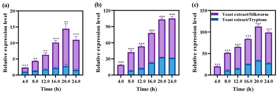 L. hilgardii cells were separately grown in GYP complex medium with yeast extract/tryptone and yeast extract/silkworm pupae used as nitrogen sources. Cells were cultured for different times, centrifuged at 8000 rpm and 4 °C for 5 min, and then the cells were obtained and immediately stored in liquid nitrogen. The frozen cells were ground with liquid nitrogen, and 1 mL TRIZOL (Takara, Dalian, China) was added and mixed for 15 s. Two hundred microliters of trichloromethane was added, violently shaken for 15 s, and then placed on ice for 10 min. The colorless liquid from the upper layer was carefully removed after centrifugation at 12,000 rpm and 4 °C for 15 min. Two precooled isopropyl alcohol samples were added to the upper liquid, mixed five times, and precipitated at −20 °C for 30 min. The supernatant was removed after centrifugation at 12,000 rpm and 4 °C for 15 min. One microliter of 75% ethanol was added and gently mixed five times. Finally, the supernatant was removed after centrifugation at 12,000 rpm and 4 °C for 5 min and then dried at room temperature. The precipitate was the cell’s total RNA.